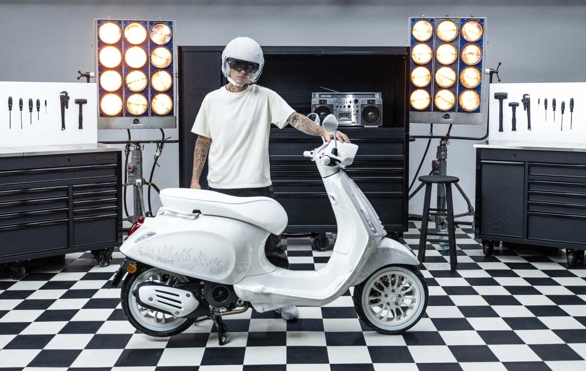 Итальянский производитель скутеров Piaggio представил ограниченную серию скутера Justin Bieber X Vespa, которая является кульминацией работы Vespa с Bieber. Культовая модель Vespa была с нами в течение многих лет, и новая модель является последней в растущем списке известных имен, имеющих импримат на бренде. Новый Justin Bieber X Vespa был лично разработан и разработан Бибером, который подчеркнул свою любовь к культовому бренду.