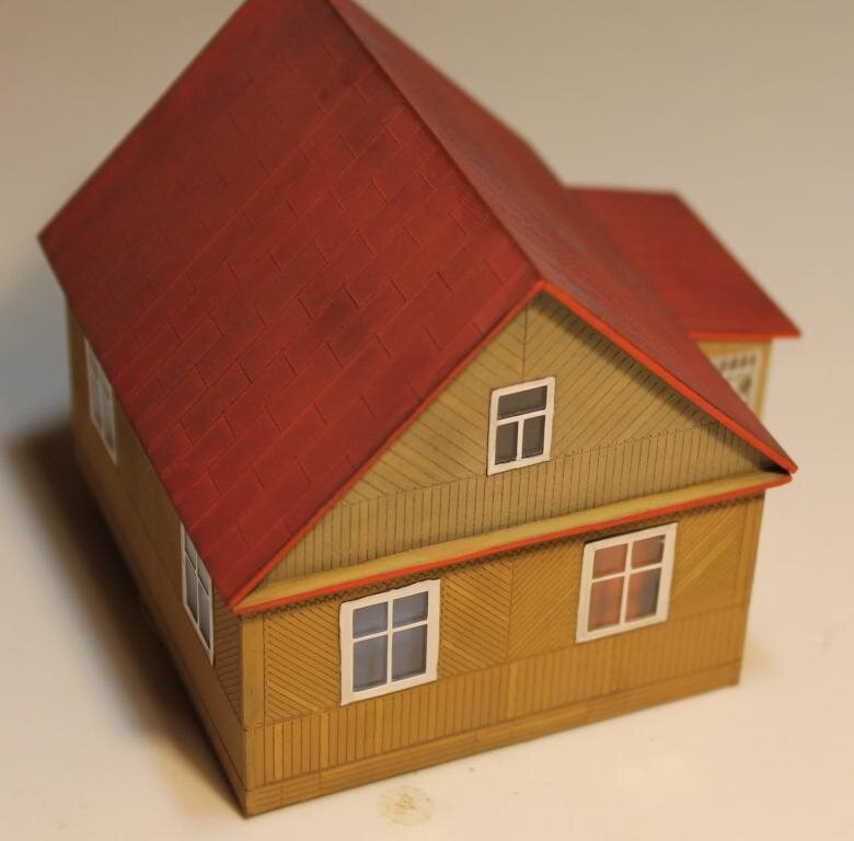 Дачный домик - одна из первых моделей от Мастерской "Знак", попавших в мои руки в далеком 2012 году. Модель была собрана очень быстро и по результатам сборки на профильном форуме ЖД моделистов был опубликован небольшой обзор на эту тему. Подробно описывать историю сборки и особенности набора сейчас смысла не имеет, так как модель уже давно не производится, да и производить ее с использованием технологий десятилетней давности смысла нет. В наши дни подобные миниатюры все больше и чаще изготавливаются методом лазерной резки по картону, реже шпону, дереву и оргстеклу, а также методом фрезеровки. А вот 10 лет назад этот набор был произведен почти вручную из листового полистирола по реальному прототипу! Домик был собран со внутренними перегородками, разделившими его на 4 комнаты. Это было сделано для того, чтобы была возможность включать освещение покомнатно, а не во всем домике сразу. При этом внутреннее убранство не предполагалось, а все окна были плотно завешаны шторами и занавесками.