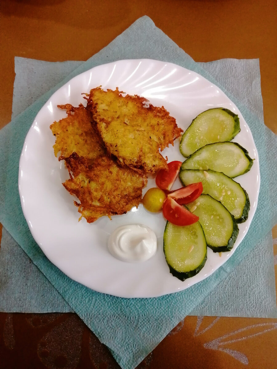 Ингредиенты: Картофель 4 шт. (крупные) Сыр 50 гр Чеснок 1 зуб. Яйца 1 шт. Соль, перец по вкусу Раст.масло для обжаривания Картофель моём, чистим, моем, трем на крупной терке, отжимаем лишний сок. Сыр трём на крупной терке. Смешиваем картофель и сыр. Солим, перчим. Хорошо перемешиваем. Добавляем пропущенный через пресс чеснок. Перемешиваем. Добавляем яйцо. Перемешиваем. Разогреваем сковороду с растительным маслом. Выкладываем массу на сковороду, по 1 столовой ложке, прихлопываем сверху (аккуратно, масло горячее😖) формируем небольшие плоские лепешки. Обжариваем с двух сторон на среднем огне до золотистого цвета. После обжаривания, выкладываем лепешки на салфетки, чтобы ушёл лишний жир. А потом на тарелку, подавать со сметаной. Вкуснотищаааа😋😋😋 #завтрак #блюда из картофеля #рецепты