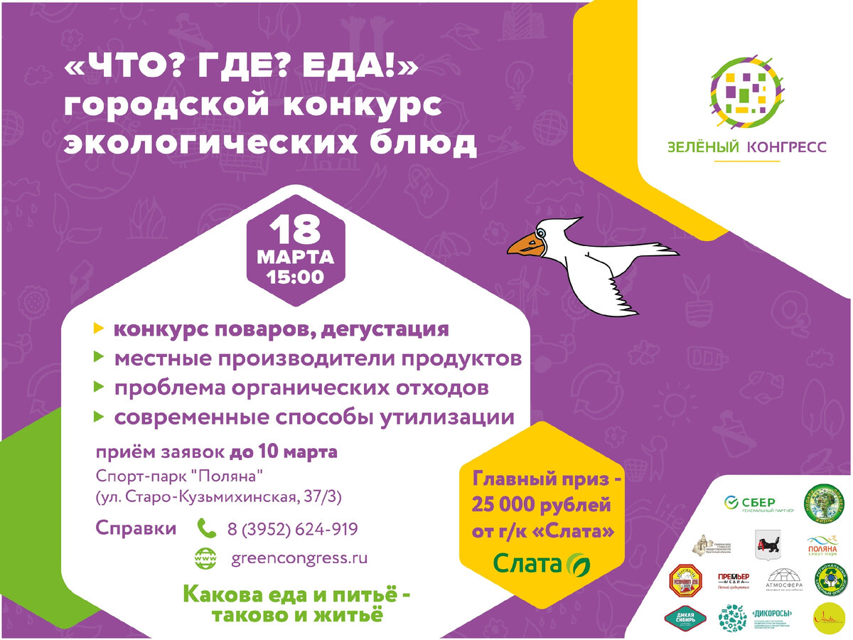 ❤Дорогие повара, вы так вкусно кормите всех нас! Приглашаем вас на кулинарный конкурс - "Что? Где? Еда!" 🛎 🌿 Он состоится 18 марта в 15:00 🌤 в Спорт-парке "ПОЛЯНА"(ул. Старо-Кузьмихинская, 37/3) в Гео-купол "АТМОСФЕРА" 😃Гран-при - 25 000 руб💰! от "СЛАТА" , супермаркеты А также подарки от местного производителя Дикая Сибирь! 🍽 Правила просты, блюдо должно соответствовать нескольким параметрам экологичности: 🌱приготовлено по местным рецептам, 🌱максимальное использование местных продуктов (т.е. с небольшим углеродным следом), 🌱форма подачи (без использования одноразовой посуды) и организация презентационного места, 🌱способ приготовления (с минимальными затратами электроэнергии). 📍Блюда можно приготовить заранее и привезти, либо на месте дегустации! ⚡Участникам необходима регистрация на сайте greencongress.ru, для гостей - вход свободный. Подробности конкурса читайте в положении на сайте. ❕Также в программе: ✅презентация фермерских товаров, ✅ответы на