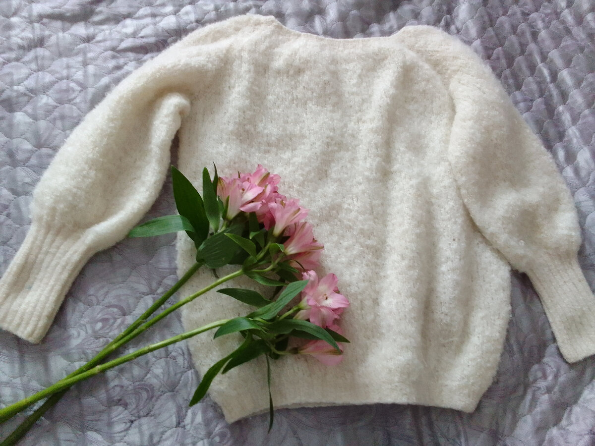 Захотелось мне как то связать свитер размера оверсайз из букле. Пряжа была выбрана alize naturale boucle. Т. к. свитер мне захотелось срочно, пришлось покупать пряжу в магазине, а не ждать интернет заказ. К сожалению, нужного цвета в магазине было только три мотка. Пройдя ещё по нескольким магазинам, такую пряжу я не нашла вообще. Хорошо продавец подсказала что манжеты можно связать другой пряжей. Подумав немного дома над фасоном свитера, решила что продавец права. Купила на манжеты пряжу от Yarn art, silk Royal. Она идеально подошла по цвету и толщине нити к буклированной пряже. Решила связать объёмные рукава с удлиненой манжетой-резинкой. Вязала реглан сверху. Сначала связала рукава, потом тело свитера на круговых спицах. Вязала до тех пор, пока не кончились все мотки буклированной пряжи. Резинку снизу свитера и горловину также связала пряжей silk Royal. То что получилось в итоге, мне очень нравится. Свитер вышел невероятно тёплый, удобный. Букле совсем не колется. При стирке с