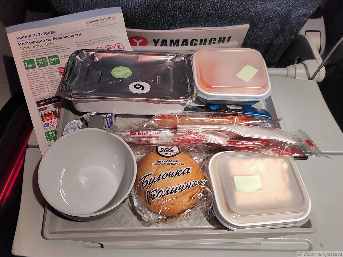 Традиционный отчёт из серии "Культ еды в самолёте" на рейсах из Москвы в Петропавловск-Камчатский и обратно. Вечерний рейс № SU1730 на Boeing 777-300ER по расписанию должен был вылететь в 17:10, но немного задержался из-за того, что погода была около нуля, повалил снегопад и самолёт отправили на антиобледенительную обработку. Ускоренное видео этой красоты, наступление ночи, а также взлёт можно посмотреть тут: Через полтора часа после взлёта разнесли соки и воду, после чего раздали подносы с горячим ужином. Напомню, как кормили 1,5 года назад: Курица с рисом или говядина с картошкой? Итак, в наборе: горячее, салат из моркови и пекинской капусты с парой ломтиков карбоната, майонезный соус, масло сливочное, булочка столичная, пирожное, сырок плавленый, кусочек чёрного хлеба в индивидуальной упаковке, набор пластиковых приборов, соль, перец, зубочистка. Масло хорошо бы сразу бухнуть в гарнир, пока тот горячий. Особенно заходит, когда летишь утром и можно таким образом дополнить кашу на зав