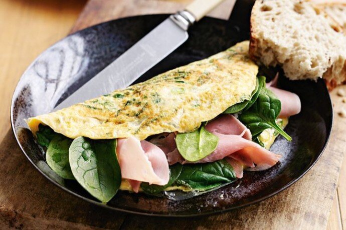 5. Выложите на одну половину омлета ветчину и оставшуюся половину шпината. Сложите омлет напополам. Переложите на тарелку.