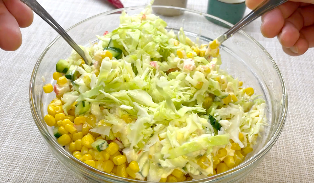 Божественной вкусный салат к 8 Марта: готовлю хоть на праздник, хоть на каждый день! Очень вкусно и легко запомнить рецепт. Салат очень свежий благодаря молодой капусточке и сочному хрустящему огурчику. Готовится буквально за 5 минут, а съедается мигом! Давайте приготовим его. Нашинкуем капусту (по возможности лучше взять молодую). Нарежем свежий огурчик. Нарежем на небольшие кусочки крабовые палочки. Добавим банку консервированной кукурузы. Немного посолим и приправим майонезом. Всё тщательно перемешаем. Быстрый, свежий и очень вкусный салат готов! Приятного аппетита! Рецепт: