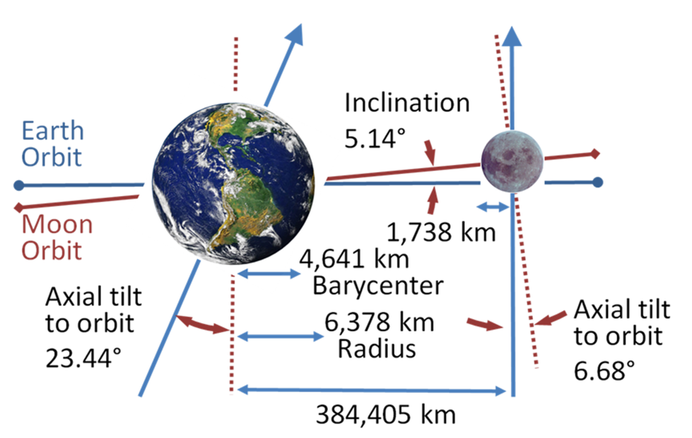 Луна - естественный спутник Земли, которая, как космическое тело, влияет на законы физики Земли. Если мы хотим сделать любые физические расчёты на Земле, точность которых более 1% , нам придётся учитывать влияние Луны. Форма Луны близка к шару с диаметром 3476 км, но слегка вытянута в направлении к Земле,. Луна прекратила своё вращение из-за истощения энергии вращения и момента инерции на приливные эффекты, и всегда направлена к Земле одной стороной. Но если рассматривать «Вращение Луны» в более высокой иерархии, например связанной с барицентром Солнечной системы, то можно сказать, что период вращения Луны совпадает с её периодом обращения вокруг Земли и Луна имеет свой наклон плоскости вращения к плоскости эклиптики. Но это будет абсолютно неграмотное заявление с точки зрения физики небесной механики. В иерархии систем отсчёта существует, вытекающее из законов физики, средневековое правило «Вассал моего вассала не мой вассал». Никакого наклона оси вращения Луны нет, это просто следствие закона сохранения момента импульса в более высокой по иерархии сситеме отсчёта.