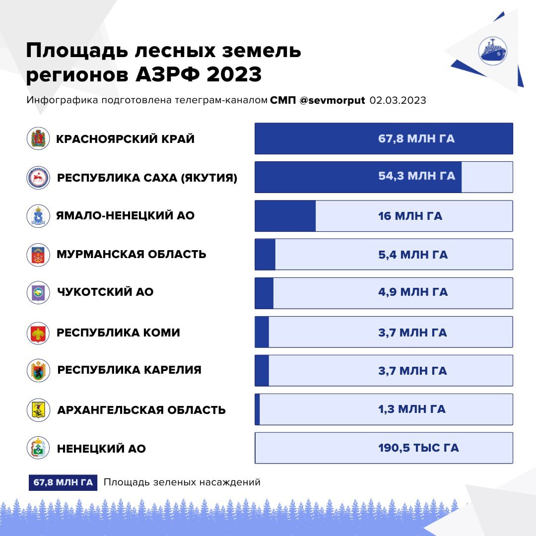 Красноярский край, Якутия и Ямал занимают лидирующее положение по площади арктических лесов среди всех субъектов АЗРФ. При этом только около трети территории Арктики занято зелеными насаждениями. Впрочем, этого количества хватает, чтобы поддерживать существующий природный баланс, несмотря на многочисленные лесные пожары в той же Якутии и Красноярском крае, а также незаконные рубки. В Арктической зоне Красноярского края площадь леса достигает почти 68 млн га, в Якутии — 54,3 млн га, на Ямале — на 16 млн га. Аутсайдером по этому показателю стал НАО, где растительность занимает примерно 190 тысяч га. Все они относятся к тундровой зоне. При этом согласно данным Рослесинфорга, ЧАО, ЯНАО, НАО и Мурманской области площадь хвойных лесов на порядок превосходит территорию, занимаемую лиственными породами. Наибольший разрыв отмечается в НАО — в 24 раза. Кроме того, именно в Арктике произрастают самые возрастные деревья, так на Чукотке их средний возраст превышает 130 лет. В большей части регионов