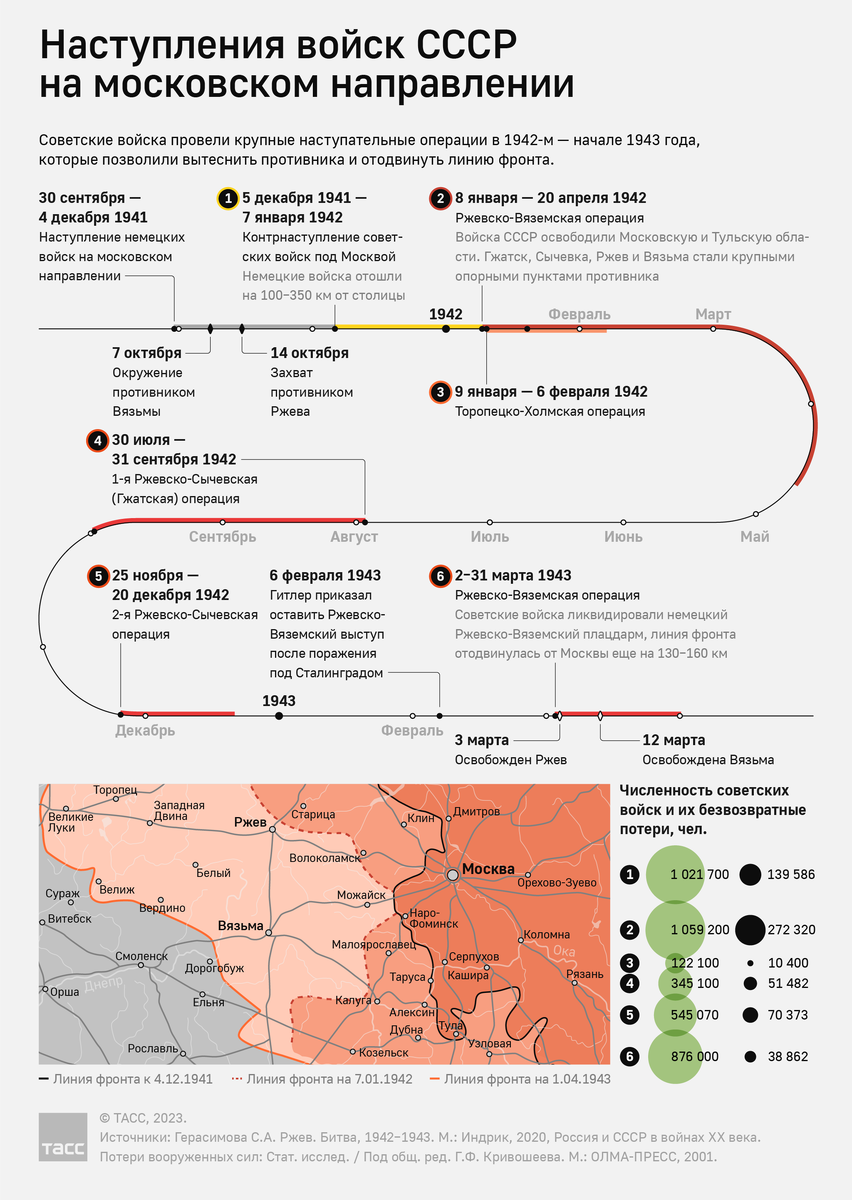 80 лет назад, 12 марта 1943 года, в ходе Ржевско-Вяземской наступательной операции советские войска освободили Вязьму. Город находился в немецкой оккупации с октября 1941 года и был разрушен: из 5,5 тыс. зданий уцелело несколько десятков домов на окраине. Красная армия потеряла свыше 440 тыс. человек с января 1942 по март 1943 года. В течение этого времени советские войска провели крупные наступательные операции в попытках вернуть города, захваченные немцами в ходе продвижения на московском направлении. Так, они полностью освободили Московскую и Тульскую области, часть территорий Калининской (совр. Тверской) и Смоленской областей. Однако операции не удавалось довести до конца: более года главной задачей оставалось вытеснение противника с Ржевско-Вяземского плацдарма, который образовался на центральном участке советско-германского фронта. Подробнее об освобождении Вязьмы и Ржева, а также главных наступательных операциях, проведенных на этом направлении в 1942 — начале 1943 года, — в инф