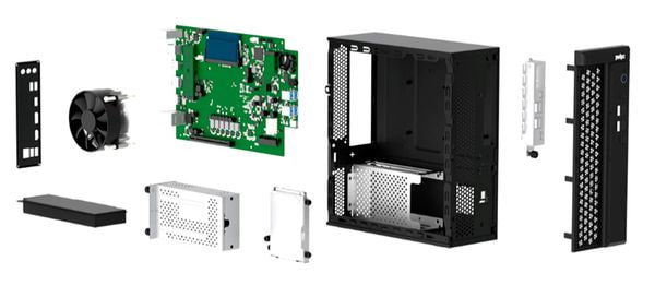 Компьютер имеет объём всего 7 литров и базируется на 35-ваттном процессоре Core 12th Gen. Материнская плата необычного формата. Она на 36% меньше стандартной, а для производства нужны 1400 компонентов вместо обычных 1800. Также узел питания на 6% эффективнее стандартного. Нетрудно заметить набор интерфейсов по самому минимуму.