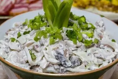 Как я готовлю салат из кальмаров, маринованных грибов, соленых огурцов и домашнего майонеза