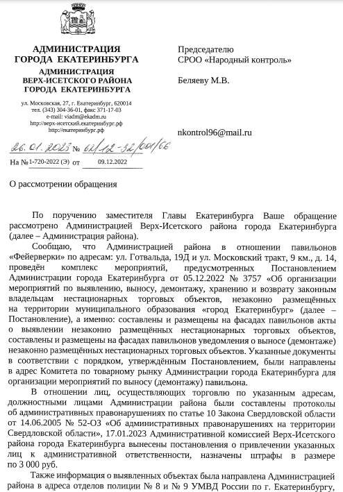 Публикуем ранее поступивший ответ по обращению жителей Екатеринбурга по поводу установленного торгового объекта, предназначенного для продажи пиротехники, который перекрывает проход на Готвальда (https://nkregion.ru/news/kiosk-s-pirotehnikoj-na-gotvalda-perekryvaet-prohod/). По поручению заместителя Главы Екатеринбурга Ваше обращение рассмотрено Администрацией Верх-Исетского района города Екатеринбурга (далее — Администрация района). Сообщаю, что Администрацией района в отношении — павильонов «Фейерверки» по адресам: ул. Готвальда, 19Д и ул. Московский тракт, 9 км., д. 14, проведён комплекс мероприятий, предусмотренных Постановлением Администрации города Екатеринбурга от 05.12.2022 № 3757 «Об организации мероприятий по выявлению, выносу, демонтажу, хранению и возврату законным владельцам — нестационарных торговых объектов, незаконно — размещённых на территории муниципального образования «город Екатеринбург» (далее — Постановление), а именно: составлены и размещены на фасадах павильонов