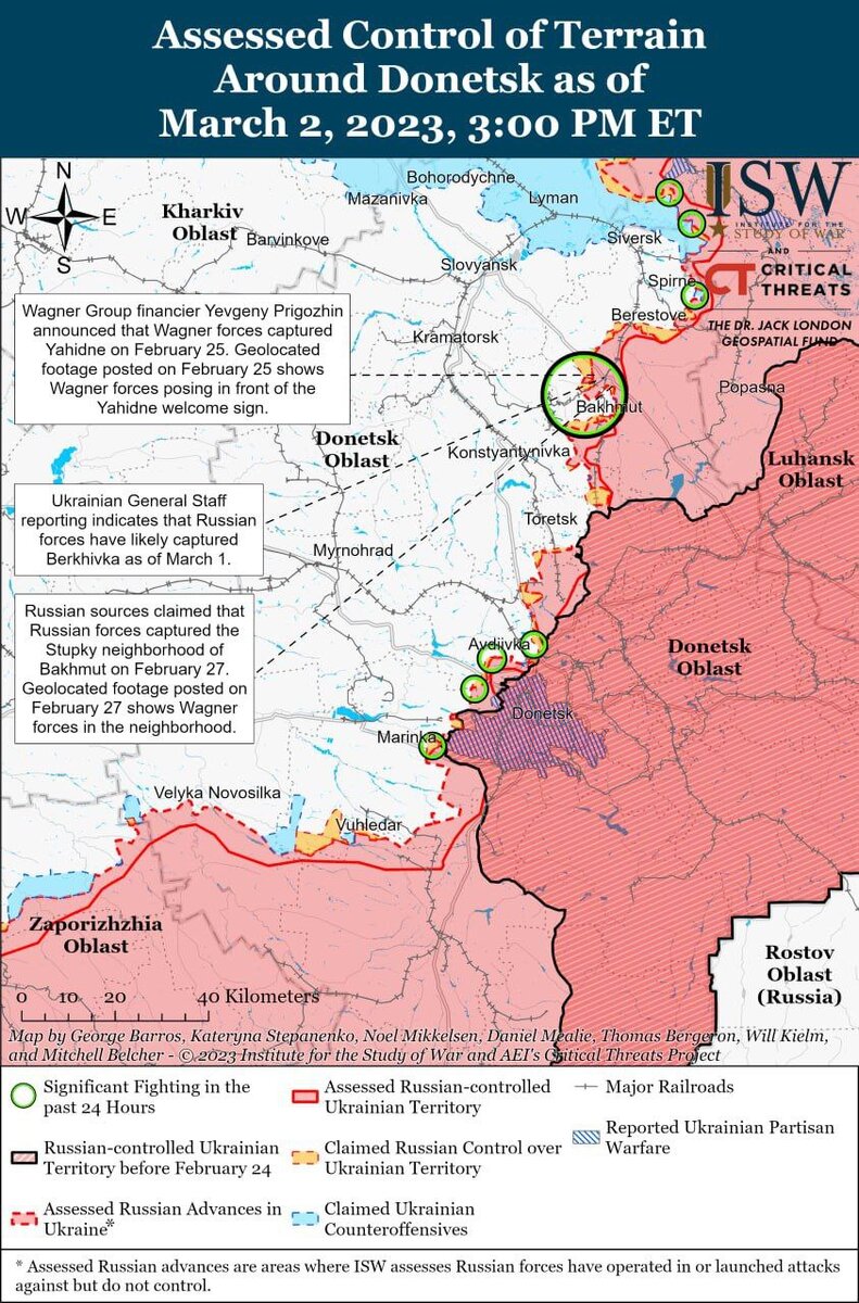 Российские силы, по-видимому, временно свернули усилия по окружению Артёмовска с юго-запада, а также с северо-востока и вместо этого могут сосредоточиться на том, чтобы заставить украинские войска отступить из города.