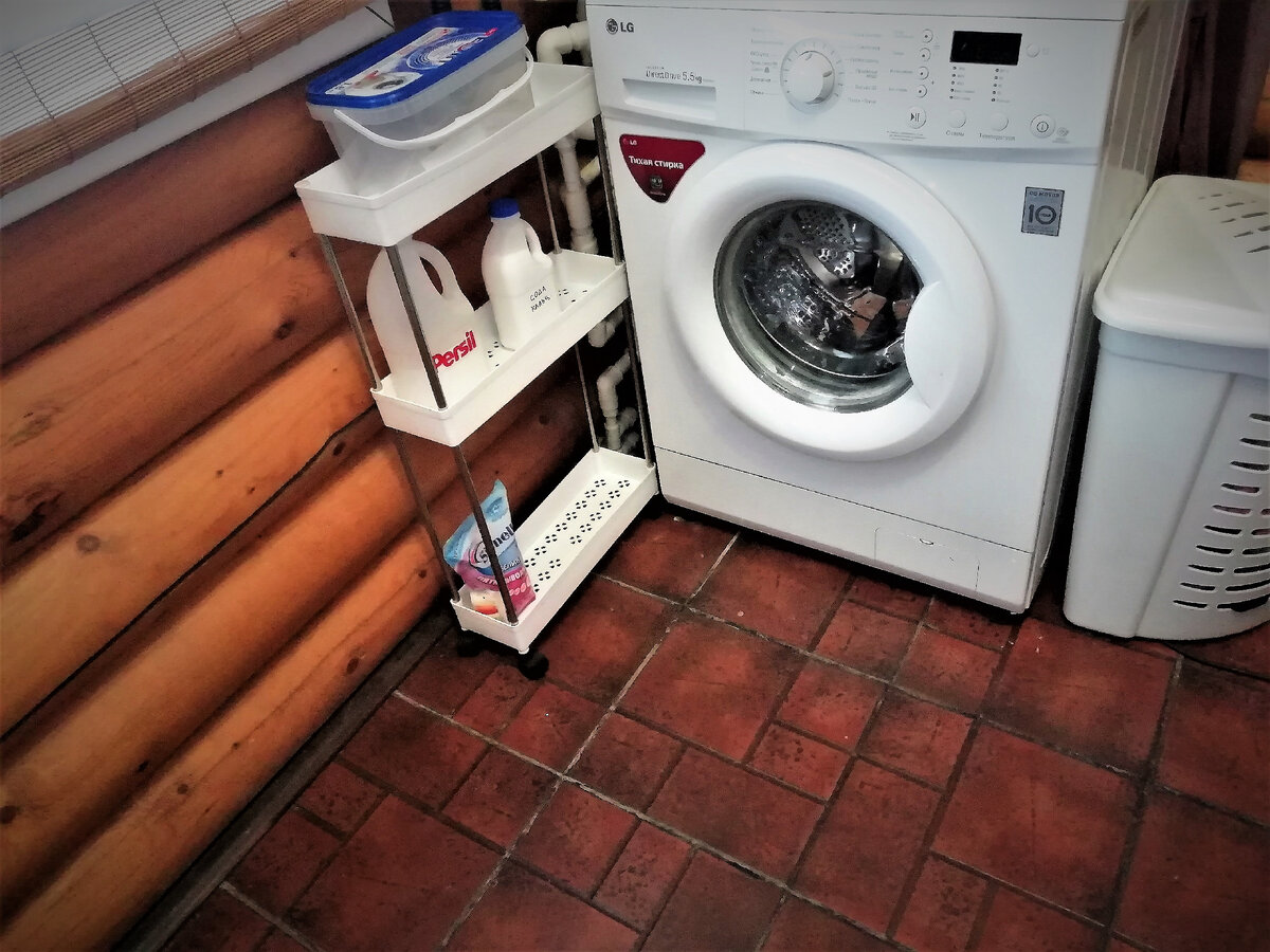На днях в моей ванной появилась вот такая узкая выкатная этажерка, которая полностью закрыла вопрос с хранением средств для стирки. Цена вопроса 1100 рублей. Мне, правда, не совсем повезло, между стиральной машинкой и стеной у меня куча труб отопления ведущих к котлу, а так многие успешно задвигают такие этажерки в небольшие проемы, что смотрится еще лучше, но в целом все равно стало гораздо удобнее. Я знаю, что вопрос хранения моющих средств в ванной больной для многих хозяек. Честно говоря, я это тоже как-то не спланировала изначально. Мне казалось, что шкафчика под раковиной вполне мне хватит для всего, что нужно. Сначала я действительно умудрялась сложить все необходимое в шкафчик под раковиной, но доставать оттуда мне было не очень удобно. Потом я оставила чистящие средства там, а стиральный порошок и средство от накипи поставила на пол к стиральной машине. Это решение тоже оказалось не совсем удачным, с моими проблемами с поясницей каждый раз брать что-то с пола тоже было очень