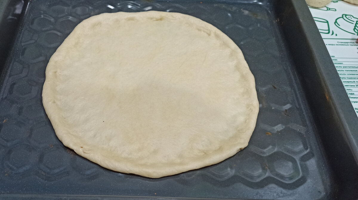 Затем раскатываем круг, оставляя толстыми края, то есть вы при раскатке нажимайте сильнее на скалку в середине круга, а края не катайте и получится заготовка под пиццу. Перекладываем на противень и руками поправляем.