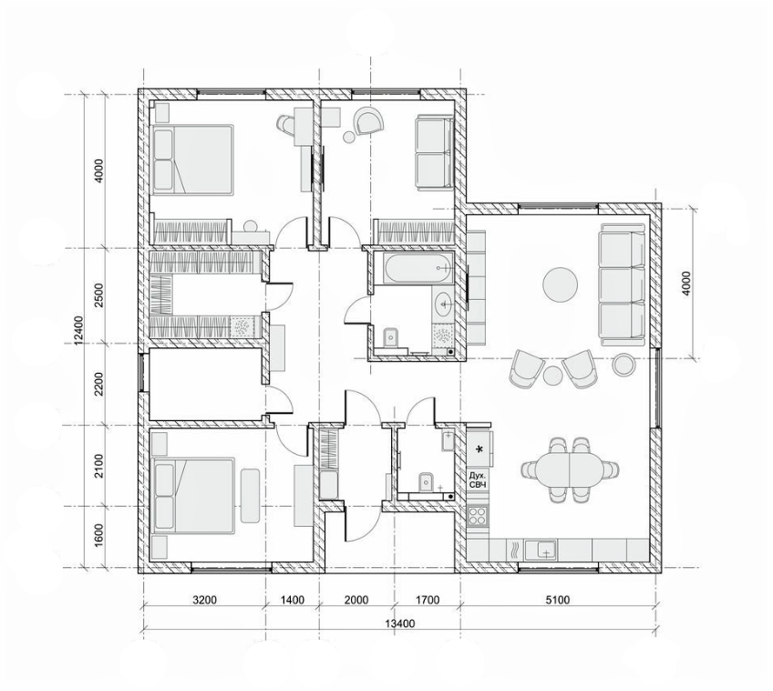 В данном доме проживают семейная пара с дочкой-подростком. Дом сдавался без внутренней отделки, поэтому для создания грамотного, красивого и функционального пространства прибегли к помощи профессионального дизайнера. Проект Прихожая Прихожая выполнена в светлых тонах. На полу уложена плитка с геометрическим узором, а стены покрашены краской. Слева от входа появилась мягкая банкетка и большой шкаф для одежды. Кухня-гостиная При входе в помещение, с правой стороны, расположилась зона кухни. Для стен выбрали нейтральный серый оттенок. На полу уложили ламинат. Кухонный гарнитур установили буквой Г. Верхний ярус шкафов установили только по одной стене, так как места для хранения здесь предостаточно, и не было смысла утяжелять пространство. Фасады имеют молочный оттенок. Мойку установили возле окна. В центре кухни появилась столовая группа с пудровыми стульями. На противоположной стороне от кухни разместили зону гостиной. Здесь преобладают светлые и пастельные тона в сочетании с яркими ак