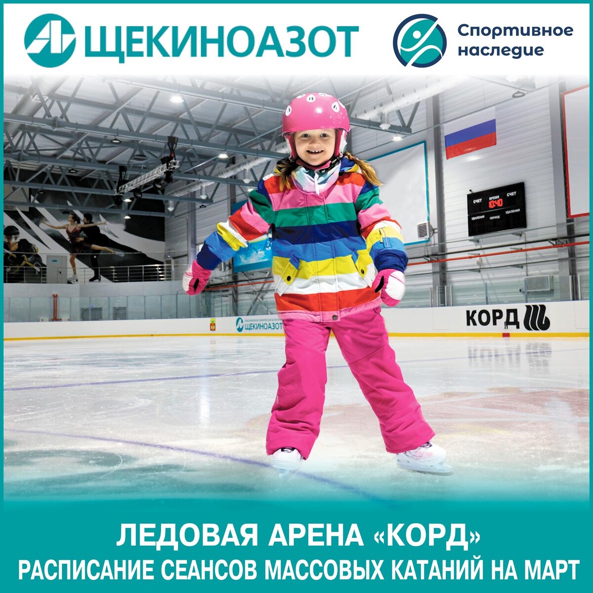 Ледовая арена «Корд», работающая при поддержке компании «Щекиноазот» и АНО «Спортивное наследие», приглашает всех покататься на коньках. Сеансы массовых катаний ждут посетителей каждые выходные: в субботу и воскресенье, 4, 5, 11, 12, 18, 19, 25, 26 марта, с 12:00 до 19:45. Продолжительность одного сеанса — 45 минут. Входной билет для взрослых – 250 рублей, для детей – 150 рублей. Прокат коньков – 150 рублей, шлемов – 100 рублей. Есть льготы! Дети до 6 лет включительно могут кататься бесплатно.