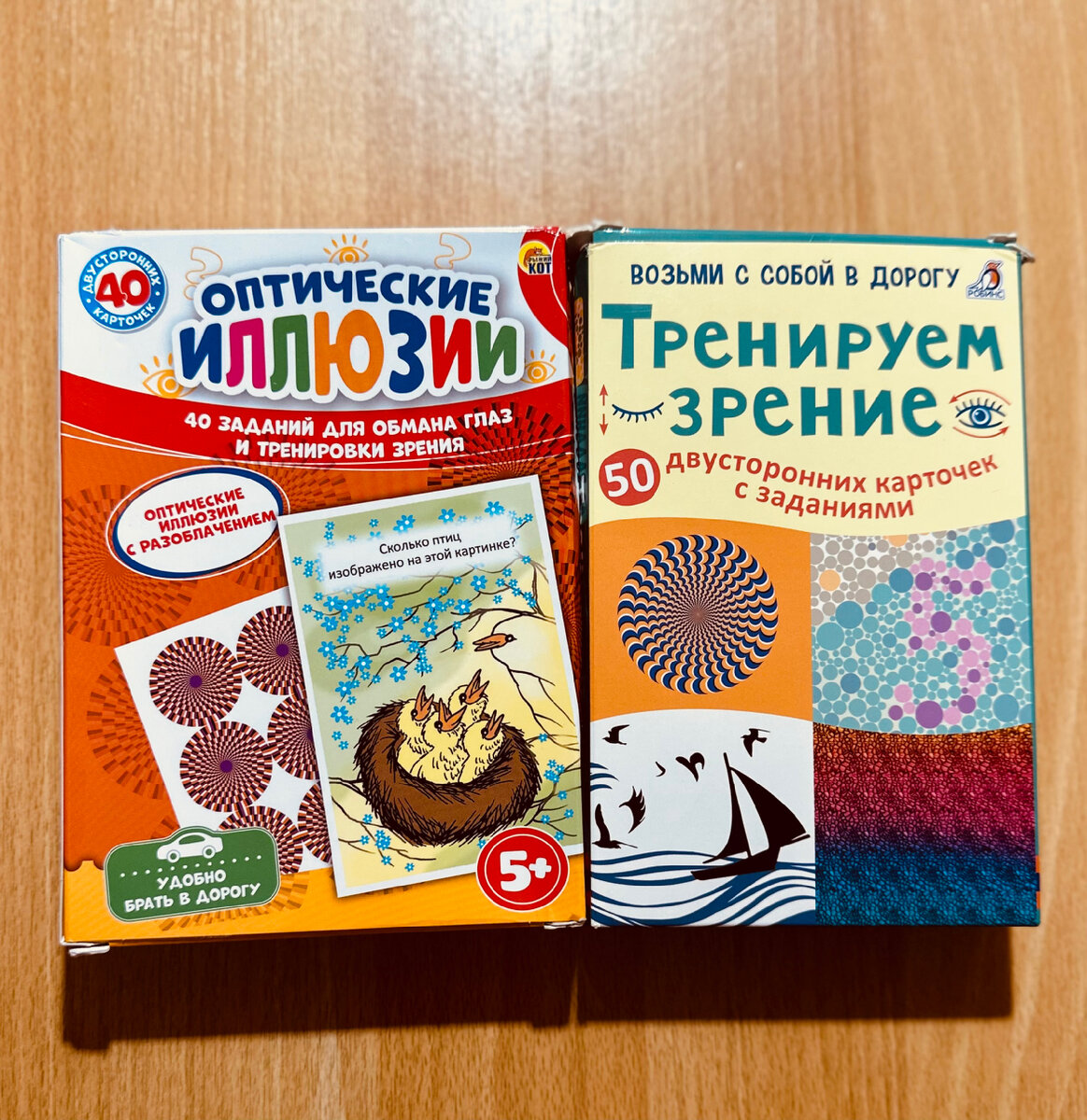 Две полезные коробочки! Небольшой размер, плотный ламинированный картон, достаточное количество карточек, разнообразные задания. Средняя цена - 400 руб. 1. «Оптические иллюзии» 40 двусторонних карт, издательство «Рыжий кот». 2. "Тренируем зрение", 50 двусторонних карт, издательство «Робинс». «Созданы при поддержке ведущих офтальмологов специально для профилактики утомляемости глаз, улучшения, коррекции, восстановления и разгрузки зрения. В набор входят карточки со зрительной гимнастикой, стереограммами, полихроматическими картинками, оптическими иллюзиями, а также популярные игры для профилактики «ленивого глаза» лабиринты, путаницы, «Кто здесь лишний», «Соедини по точкам», «Найди отличия» и др. Важно знать • Регулярные занятия по карточкам помогут разгрузить и улучшить зрение, избавить глаза от усталости как детям в возрасте от 5 лет, так и взрослым. • Рекомендуется использовать карточки после длительной однообразной работы, требующей напряжения глаз: чтения, работы за компьютеро