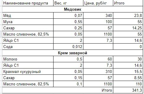 На днях пекла тортик. Задумалась, сколько же стоит 1 кг медовика в домашних условиях. А считать я люблю. Результаты в таблице. Цены брала с сайта Магнита. По этому рецепту выходит тортик около 1,5 кг. А значит, себестоимость килограмма медовика обойдётся примерно в 226₽.