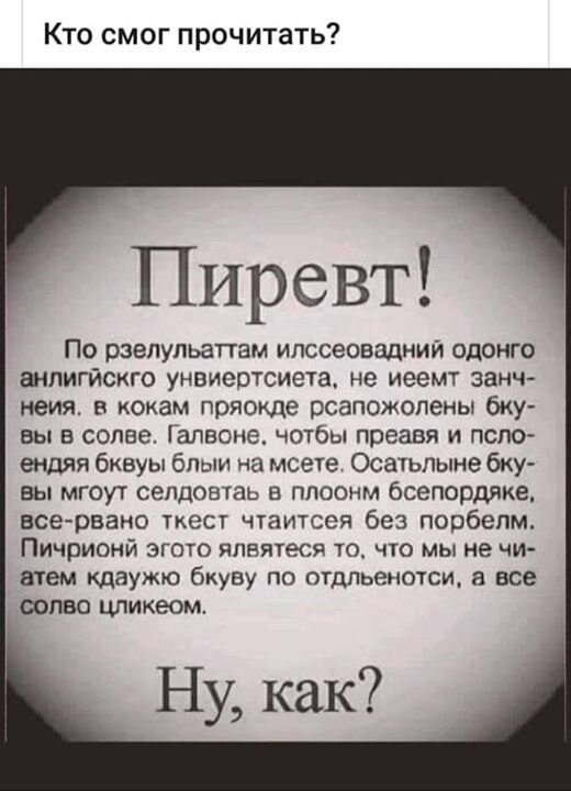 Что за абракадабра - сначала подумал я... и с удивлением обнаружил, что читаю этот текст. И целое открытие прочитал, что "причиной этого является то, что мы не читаем каждую букву по отдельности, а все слово целиком". Так ведь так оно и есть, тем более когда текст неинтересный, лично я просто бегло просматриваю и если что-то привлекло, зацепило, то тогда и вчитываешься буквально в каждое слово... Вот такое интересное открытие, никогда не обращал на это внимание. А Вы??? Сегодня для позитива хочется представить вашему вниманию следующие картинки. Из которых узнаем: 2) Что книга лучший подарок. Все мы в своё время зачитывались Д.Х.Чейзом и поэтому, если не брать во внимание название произведения, то подарок от мужской половины хора к Международному женскому дню 8 Марта вполне достойный. 3) Кулинария всегда и повсюду привлекала мужчин и не мало из-за этого попало в брачные сети и угодили в брак). Ведь путь к сердцу мужчины лежит через его желудок и любая женщина старается приготовить тако