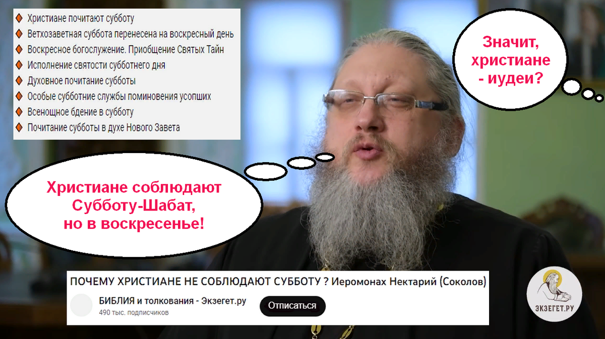 Этот иеромонах (кстати, как перевести, если монах - бездельник, а что такое иеро?) объясняет в своём видео-ответе, что христиане СОБЛЮДАЮТ Шаббат, только её перенесли на следующий день, который иудеи называют первым, для нас он седьмой, как и седьмой день у иудеев - суббота. Иными словами, знают христиане или не знают, но они СОБЛЮДАЮТ иудейскую субботу, как завещал израильтянам их Бог - Яхве. Вот такие пирожки с котятами, дорогие православные иудеи, вас обманули! Вас правильно называть христианскими иудеями или необрезанными иудеями, но вы не то, что о себе думаете! И спорить не надо, ваша Библия состоит из двух основных Заветов, Ветхого (Тора) и Нового (Евангелия). Так что шалом, православные! Воистину шалом!