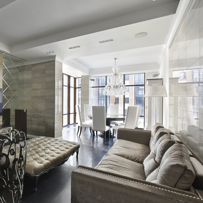 На каждой фотографии можно увидеть встроенные в потолок колонки. Все они объединены в систему мультирум, что позволяет управлять ими как единой аудиосистемой. Мы заботимся о том, что важно для Вас.