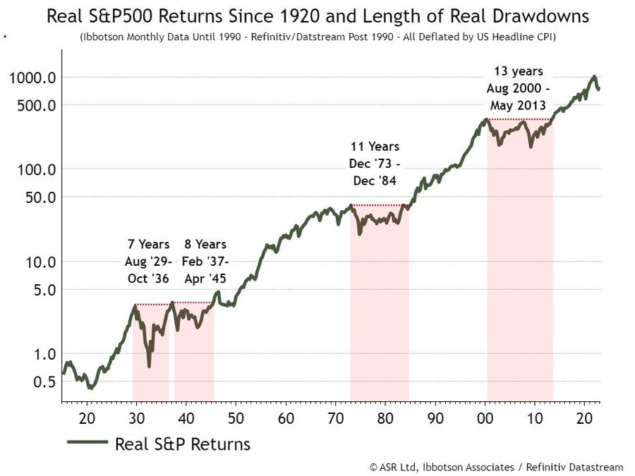 Часто в комментариях я встречаю вопросы или утверждения, что вот, мол, портфель не обогнал инфляцию в этом году или за пару лет. Вот купил акции, а они не выросли даже на размер инфляции. Сегодня будет большая и достаточно важная статья, которая поможет вам наконец-то уложить в голове тот факт, что вас не должно волновать локальное поведение портфеля, куда более важно среднее значение его результатов. Ну и, конечно же, грамотно подобранные активы под ваш горизонт. В статье я буду использовать материалы из исследования Edward F. McQuarrie, которое вы можете скачать по ссылке https://papers.ssrn.com/sol3/papers.cfm?abstract_id=3805927. Я не буду пересказывать его, а воспользуюсь статистическими данными для иллюстрации своих слов. Итак, для меня совершенно очевидно, что на рынке есть периоды (и довольно длительные), когда акции не обгоняют инфляцию, а даже наоборот, могут приносить их держателям убытки. Чтоб в этом убедиться, предлагаю посмотреть на диаграмму ниже. Красным обозначены пери