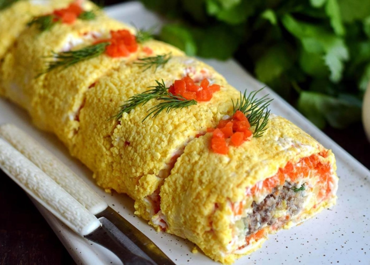 Подайте знакомый и любимый многими салат в форме роллов. Времени на его приготовление уйдёт столько же, сколько и для обычного варианта. А вот восторг и удивление гостей будут обеспечены. Понадобится Приготовление Заранее отварить картофель, морковь и яйца. Остудить, очистить и промыть проточной водой. На рабочую поверхность застелить пищевую плёнку. Укладывать салат слоями. 1 слой. Желтки. Натереть на мелкой тёрке и выложить ровным слоем в форме прямоугольника на плёнку. Сверху покрыть сеточкой из майонеза. 2 слой. Плавленый сырок. Натереть на мелкой тёрке и распределить вторым слоем, отступая сверху и снизу около 1см. Покрыть сеточкой из майонеза. 3 слой. Морковь. Натереть на мелкой тёрке и равномерно распределить, чуть отступая сверху и снизу от предыдущего слоя. Нанести сеточку из майонеза. 4 слой. Белок. Натереть на мелкой тёрке. Уложить аналогично предыдущим слоям, отступая сверху и снизу. Добавить сеточку из майонеза. 5 слой. Зелень. Обязательно используйте лук, остальная зелень