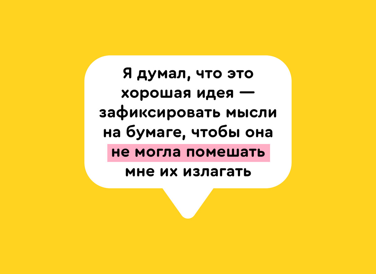 «Я думал, что это хорошая идея — зафиксировать мысли на бумаге, чтобы она не могла помешать мне их излагать», — пояснил он.