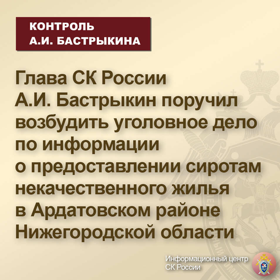 Глава СК России А.И. Бастрыкин поручил возбудить уголовное дело по информации о предоставлении сиротам некачественного жилья в Ардатовском районе Нижегородской области
