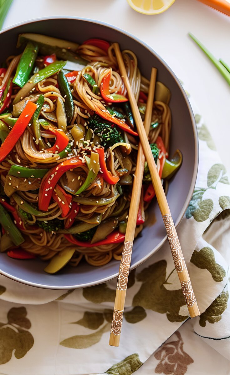 В этом рецепте мы сочетаем свежие овощи с ароматной лапшой и приправляем соевым соусом и куркумой для добавления вкуса. Этот блюдо быстро готовится и может служить идеальным вариантом на обед или ужин, которые не только вкусны, но и питательны. Следуйте нашему простому рецепту и наслаждайтесь этим блюдом вместе с семьей и друзьями! Инструкции: Это очень простой и вкусный рецепт, который можно адаптировать к своим предпочтениям, добавив другие овощи или изменяя пропорции ингредиентов. Приятного аппетита!