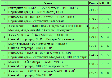 Итоговые результаты практически идентичны Первенству России. Настя Чернышова/Влад Антонышев (188.73 - 3 место) к концу сезона от старта к старту все больше скатываются. Единственная проблема - это сложность прыжкового набора. Что будет с этой парой в дальнейшем решится на уровне нашей Федерации. Влад выходит из максимально возможного юниорского возраста, а Насте в свою очередь до взрослого возраста еще расти и расти.