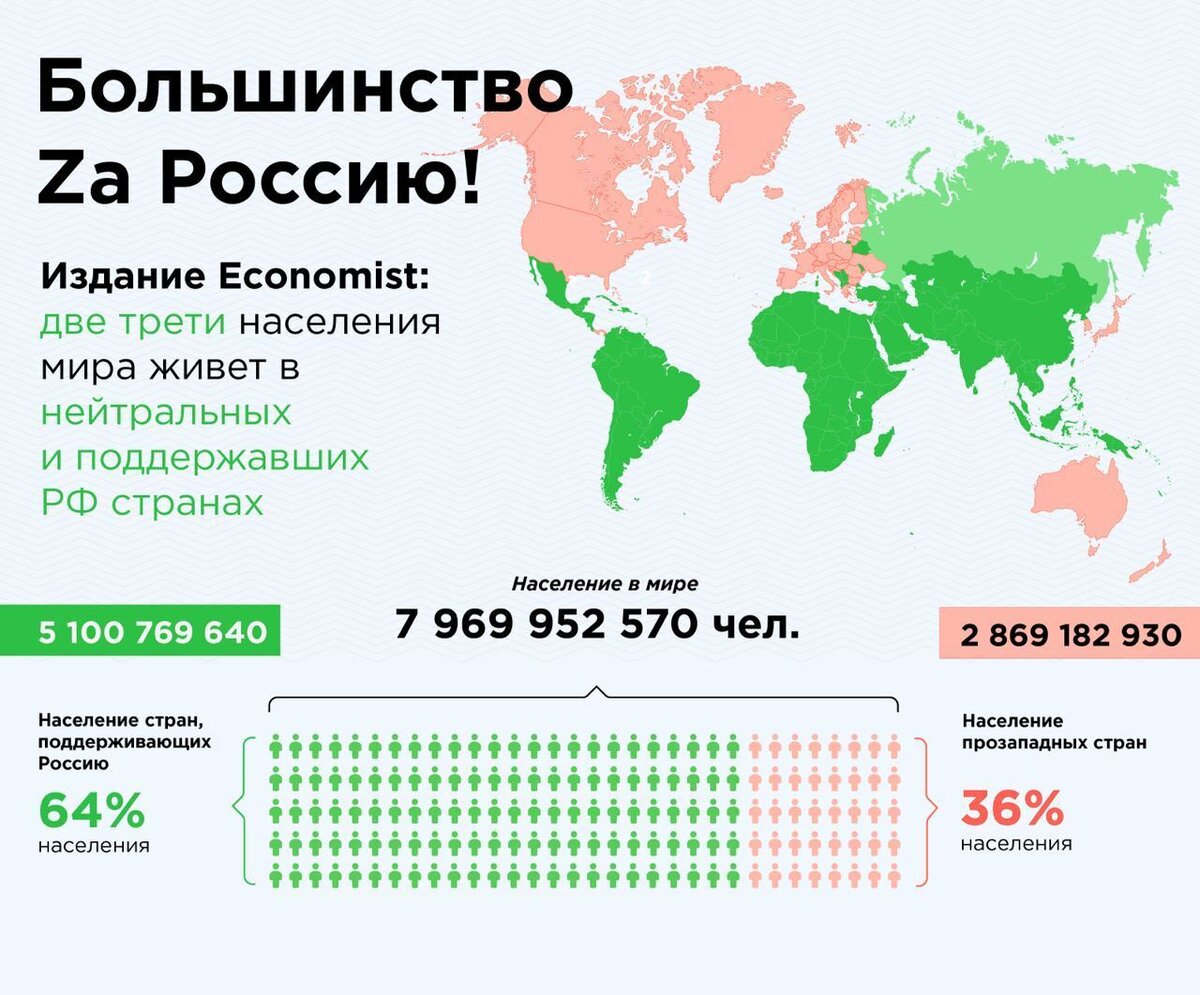 На стороне России оказались страны БРИКС: Бразилия, Индия, Китай и ЮАР, те, кто надеется в ближайшем будущем стать участниками БРИКС - Аргентина, Иран, КНДР и еще десяток аналогичных стран, страны Персидского залива, а также крупнейшие страны ислама - Индонезия, Бангладеш, Пакистан, государства Ближнего Востока и Африки. Даже Латинская Америка — за исключением Колумбии и Гватемалы, находящихся под полным контролем американцев, — и та оказалась за Россию, в том числе Мексика.