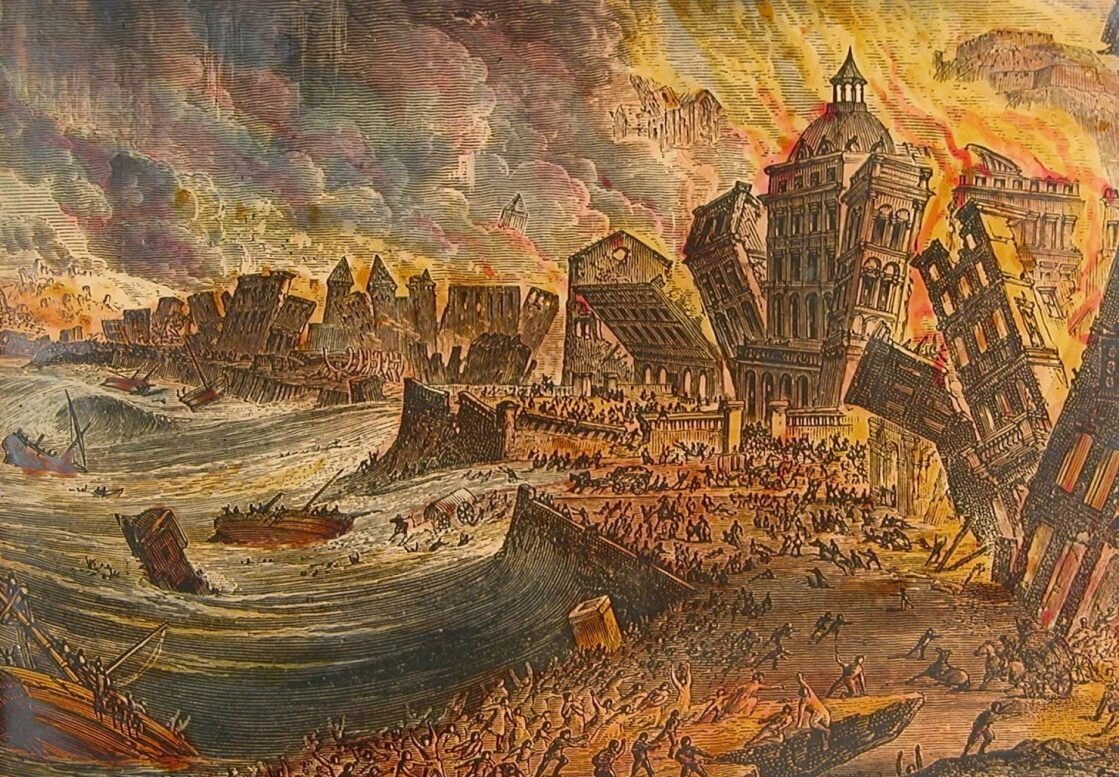 1 ноября 1755 года в роскошном Лиссабоне отмечался христианский праздник Собор всех святых. Жители города встречали гостей со всей Европы, приехавших посмотреть на богатство и великолепие столицы. В это время примерно в 200 км от побережья в Атлантическом океане произошло сильнейшее землетрясение, магнитуда которого по современным оценкам составляла 8,7 баллов. Лиссабон, стоящий на побережье, подвергся сильнейшим разрушениям. За несколько минут стихийное бедствие унесло жизни около 100 000 человек, разрушив многие здания. В уцелевших сооружениях из-за массового использования свеч во время праздника вспыхнули пожары, что привело к новым жертвам. Гигантские провалы в земле буквально отделили половину города от остальной части суши, затруднив эвакуацию раненых. А уже через несколько десятков минут Лиссабон накрыла огромная волна цунами, добавившая страдания жителям города. Менее чем за час крупнейший и богатейший город Европы был уничтожен, а количество жертв исчислялось сотнями тысяч – небывалый в истории масштаб катастрофы. В тот день были безвозвратно утеряны многие произведения искусства, библиотека с 70 000 томов, архивы о португальских исследовательских экспедициях.