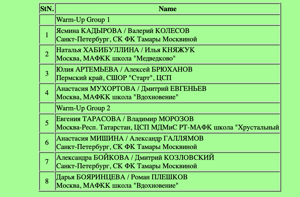 Очень сильный состав на ГПР! Делюсь впечатлениями, результатами и протоколами фигуристов. Стартовый состав: Ясмина КАДЫРОВА / Валерий КОЛЕСОВ - Санкт-Петербург Хорошее начало. И высокая сложность, и всё доработано. Не очень получился первый выброс-флип - Ясмина тяжеловато приземлилась, но всё равно на плюсы. Замечательный прокат! Результат КП: 77.32 Наталья ХАБИБУЛЛИНА / Илья КНЯЖУК - Москва Ребята уже второй сезон катают эту программу, и она по-прежнему отлично смотрится. Технически справились на отлично - всё получилось, ни одной ошибки. Где-то ещё теряли уровни, над этим надо работать. Результат КП: 76.52 Юлия АРТЕМЬЕВА / Алексей БРЮХАНОВ - Пермский край Ещё один шикарный прокат - тяжело в финале, когда спортсмены подходят на пике формы! Всё чётко, без ошибок, разве что на вращении сильно разошлись, что для зрителя не бросалось в глаза из-за ракурса съёмки. Результат КП: 79.05 Анастасия МУХОРТОВА / Дмитрий ЕВГЕНЬЕВ - Москва Ещё одна шикарная пара, но, увы, в этот раз была грубая о
