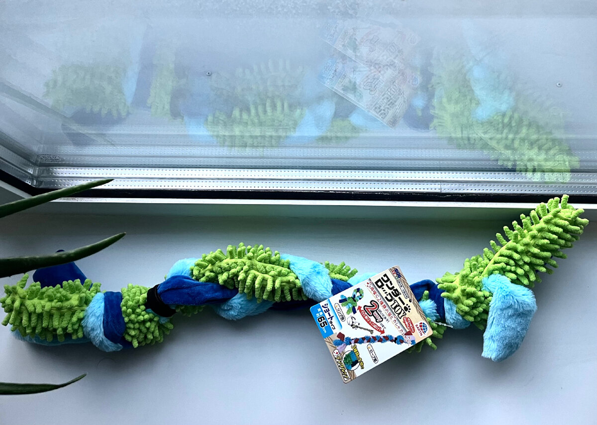 Я постоянно в поисках классных игрушек для своего щенка. Даже не смотря на то, что у нас уже целая коробка его игрушек - мне все мало 🥲 Недавно, листая Яндекс.маркет, я наткнулась на игрушки японского бренда. Понравилось, что они все яркие, с различными формами и текстурами, но особое внимание привлекла игрушка в виде веревки-косички. Так как у меня корги, а они тряпичники, я решила что это идеальный вариант, плюс цена была не особо высокой, около 700 рублей. В описании было написано, что она для чистки зубов. Верить этому или нет, решайте сами, но я не очень понимаю как она может чистить зубы, ведь по факту это просто синтетическая ткань и микрофибра. Так, а теперь давайте поподробнее рассмотрим данную игрушку. Шеди она сразу заинтересовала и он принялся в нее играть. Кусать, трепать, рвать. НО меньше чем за пол часа, он выдрал из этой игрушки несколько зеленых веревок ( к счастью не съел) и разгрыз пищалку в одном конце. Но не смотря на это игрушка целая. Однако прочно