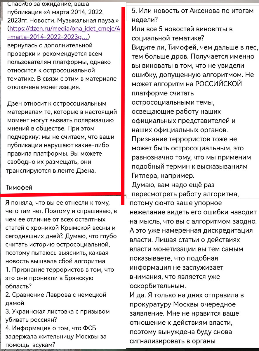 Хотела начать это воскресное утро с чего-нибудь хорошего и душевного, но из хорошего осталась одна несравненная Каро Эмеральд. 😊Открою маленький секрет - эта песня стоит у меня на рингтоне😊. А дальше будет сатира)))) Вчера вдруг ни с того ни с сего обнаружили остросоциальную тему в этой статье Что удивительно, таких уже несколько статей с хроникой, но именно в этой что-то кому-то не понравилось. Чтоб не перессказывать, прилагаю мою переписку с поддержкой Я уж не знаю, смеяться мне или плакать🤦♀️ И тут я решила вернуться к тому посту со второго канала, где цитировала Марию Захарову и где точно также меня убеждали в том, что алгоритм все делает правильно В первом ответе я подчеркнула фразу, которую признали языком вражды, а галочкой отметила самый любимый ответ поддержки - про тональность алгоритма😂😂😂😂😂😂😂. Нет слов!!!! Какой умный алгоритм...... В общем, не буду рассказывпть все перепитии, решила я в МИД написать, так мол и так, не могу делиться словами вашего официальног