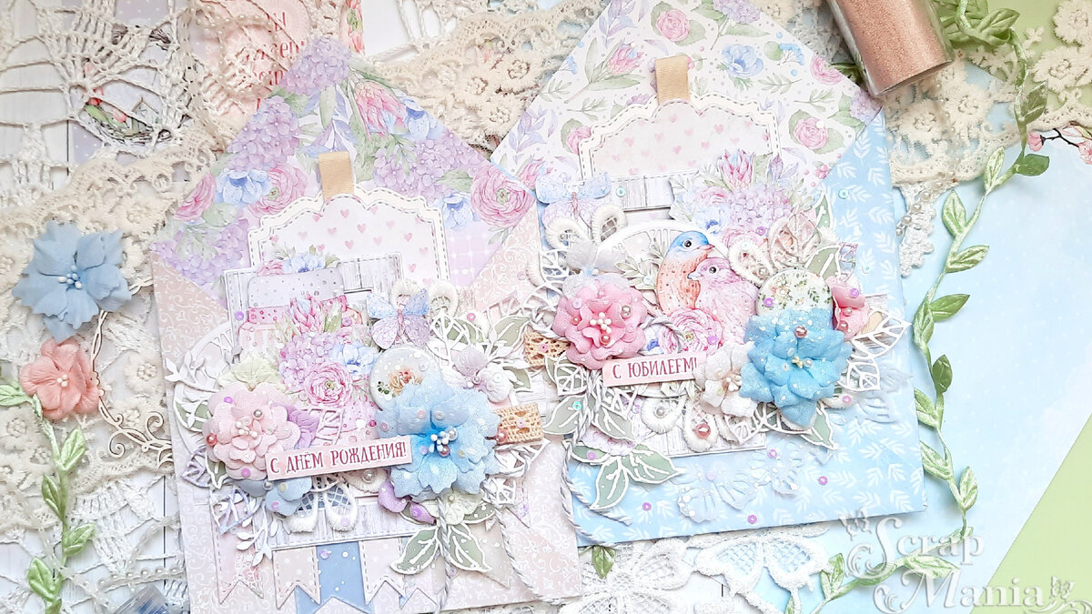 И я не случайно выбрала для моих работ по 2-му этапу форму конвертов. Это как открыть конверт и узнать что-то неизвестное. Может быть то, что ты давно ждёшь или то, что совсем не ждёшь, но в душе надеешься. В моих конвертах помимо набора бумаги 20х20см использованы и другие материалы из этой же коллекции: скрап-карта "Первая любовь. Детали" , набор карточек , а также кружево, тесьма и очень много вырубки, сделанной ножами от ТМ ScrapMania: "Листья яблони", "Листья мелкоцветов", а также нож с тиснением "Первая любовь. Бабочки". Основные элементы второго этапа: цветы (которые, как вы уже знаете, я делаю са