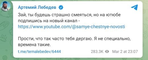 Похоже, что Лебедев не собирается мириться с блокировками предыдущих каналов. Напомним, 22 февраля YouTube заблокировал аккаунт блогера, когда подписчиков канала перевалило за миллион. Артемий не растерялся и создал еще один канал, но как только количество подписчиков на новом канале превысило 100 тыс. человек, система ограничила доступ и к нему. В четверг, 2 марта, в Telegram-канале Артемия Лебедева появилось сообщение, в котором он обращается к подписчикам с просьбой подписаться на новый YouTube-канал под названием «Вася Пупкин».