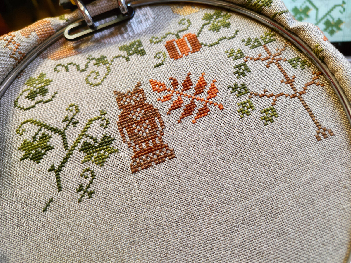 Завершён нижний бордюр в пределах пялец, доделан листочек, появилась белая тыква, наколдовала иголкой жёлудь и большую часть дуба.