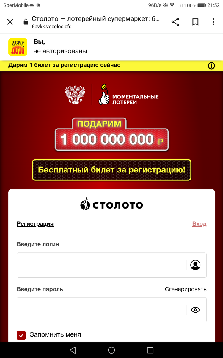 Листаю страницы социальных сетей... Да и не только сетей. Как всегда постоянно мелькают всплывающие окна вьедливой рекламы. Неожиданно натыкаюсь на рекламную акцию "Столото". Первая страница выполнена очень качественно под лотерею и даже не внушает никаких сомнений. Итак, в чем суть. Вам предлагают принять участие в розыгрыше денежных призов от "Столото", который проходит в течении одного дня с моментальной выплатой в случае выигрыша. Для этого вам предоставляется без какой либо оплаты уникальный шанс испытать удачу и выиграть солидный куш в виде бабла. Но в начале вам предлагают пройти процедуру регистрации. Логин, пароль и прочее... Есть даже опция автоматической регистрации. Теперь внимание. Как только вы закончите эту процедуру, в адресной строке поисковой системы, незаметно для вас, меняется аккаунт сайта. Таким образом вас перенаправляют на другой сайт. Но вам уже не до этого, азарт увлекает вас и вы с головой погружаетесь в лохотрон... После формальностей регистрации система пре