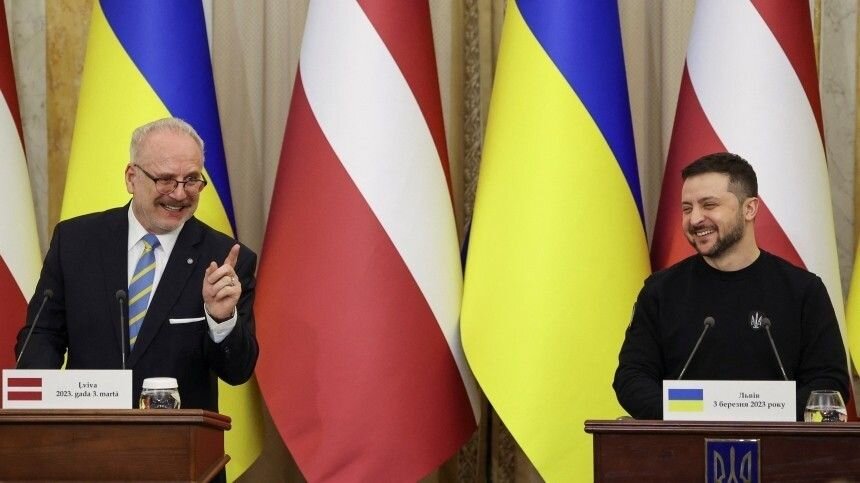 Лидер киевского режима не смог долго сохранять серьезный вид, слушая слова коллеги об устройстве Европы после «победы ВСУ». Фото: Reuters / STRINGER; Минобороны РФ; 5-tv.ru Глава киевского режима Владимир Зеленский не сумел подавить смех, когда латвийский лидер Латвии Эгилс Левитс начал говорить о необходимости восстановления Украины в границах 1991 года. Видео с пресс-конференции президентов двух стран выложено на официальном канале офиса президента Незалежной. Какие же слова так насмешили Зеленского? «Только Украина может диктовать условия, на которых будет подписано мирное соглашение. Очевидно, что долгосрочный мир должен включать полную территориальную целостность Украины», — сказал Левитс, после чего Зеленский не смог сдержать смех. Пресс-конференция по результатам переговоров двух лидеров прошла после подписания совместной декларации о поддержке европейской и евроатлантической интеграции Украины. Ранее 5-tv.ru писал, кого посол РФ в США назвал виновным в теракте в Брянске.