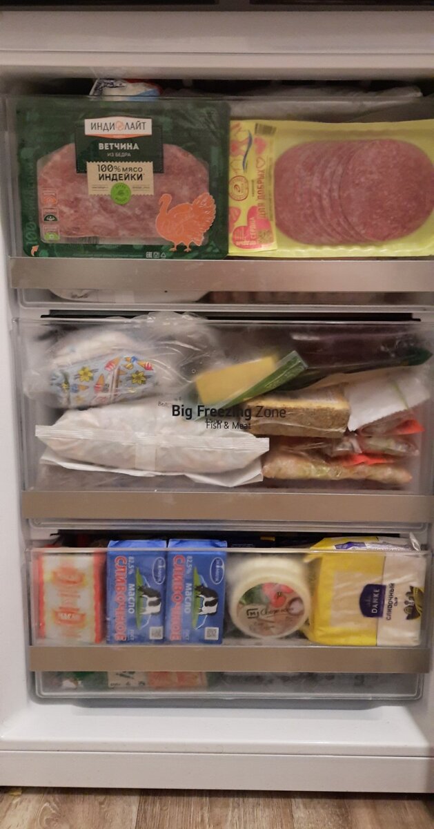 Я морозилку переписала тщательно. Опять таки для удобства. Глядя теперь на эту шпаргалку, я могу ориентироваться, что мне нужно докупить, а что нужно использовать быстрее. Скоро лето (я на это очень надеюсь.....) Пойдут всевозможные заготовки ягод, овощей, морозилку хочу по максимуму разгрузить. Мечта моя конечно морозильная камера отдельная. Но мне категорически нельзя. Потому что это новое место хранения продуктов. А у меня цель стоит именно минимизация продуктов вокруг меня и адекватное приобретение и потребление всего. В моей морозилке всего 3 ящика. Но при ревизии, я обнаружила, что там достаточно много чего умещается. Есть продукты, которые нужно использовать по назначению быстрее. И стараться постепенно разгрузить хотя бы один ящик. Итак, список! ВЕРХНИЙ ЯЩИК Кета 260 гр