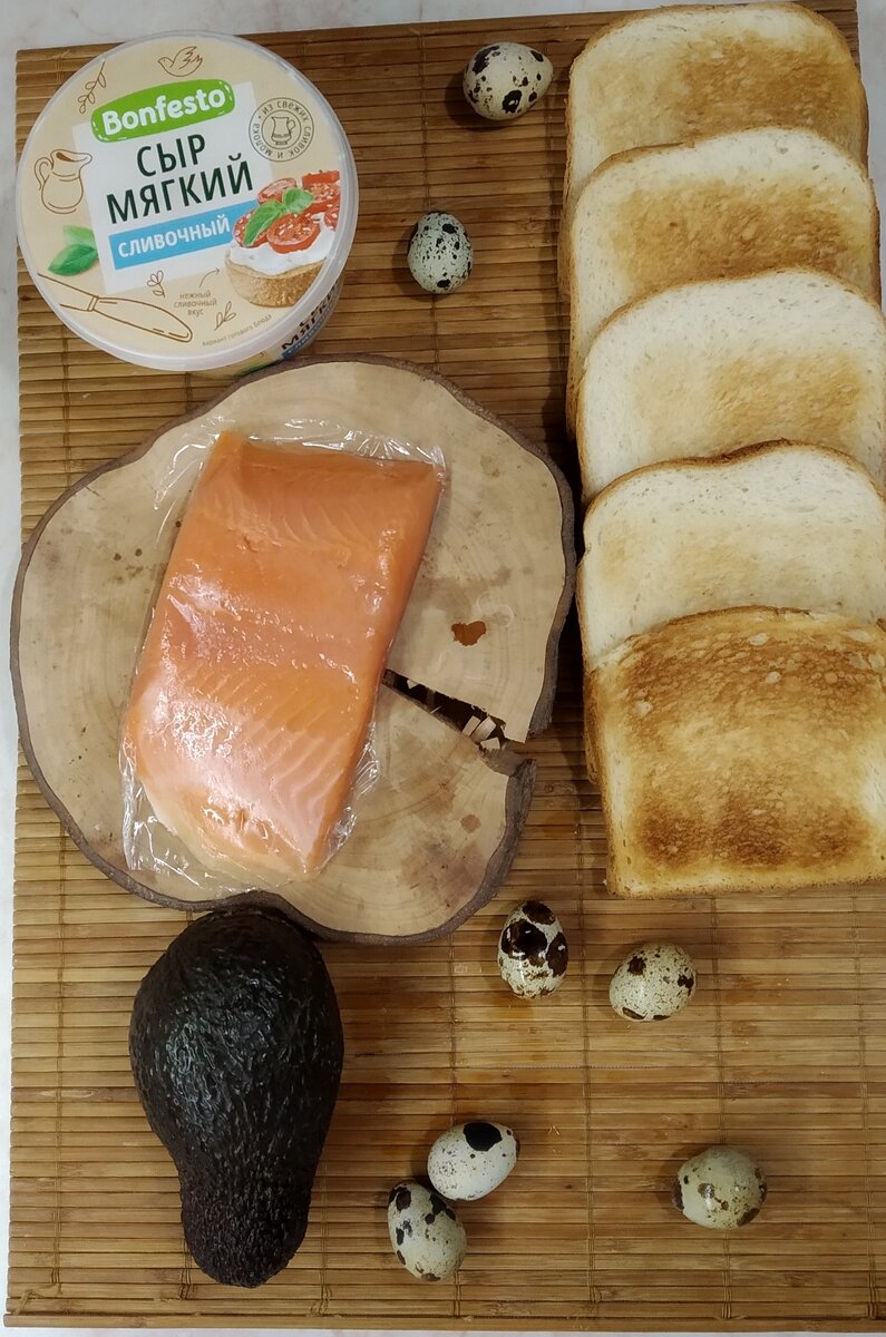 Ингредиенты на пять больших бутербродов: Авокадо 1 шт Красная рыба 150 гр Мягкий сливочный сыр 3 ст.л. Перепелиные яйца 15 шт. Хлеб Приготовление: Обжарить хлеб. Сварить яйца. Достаем чайной ложкой мякоть из авокадо и разминаем её в пюре вилкой. Добавить сыр и хорошо перемешать Достать кости из рыбы и нарезать тонкими широкими слайсами Очистить яйца от шкарлупы. Нарезать тонкими кольцами. Намазать хлеб смесью авокадо и сыра, положить сверху рыбу и яйца. Сытные питательные бутерброды готовы. Приятного аппетита .