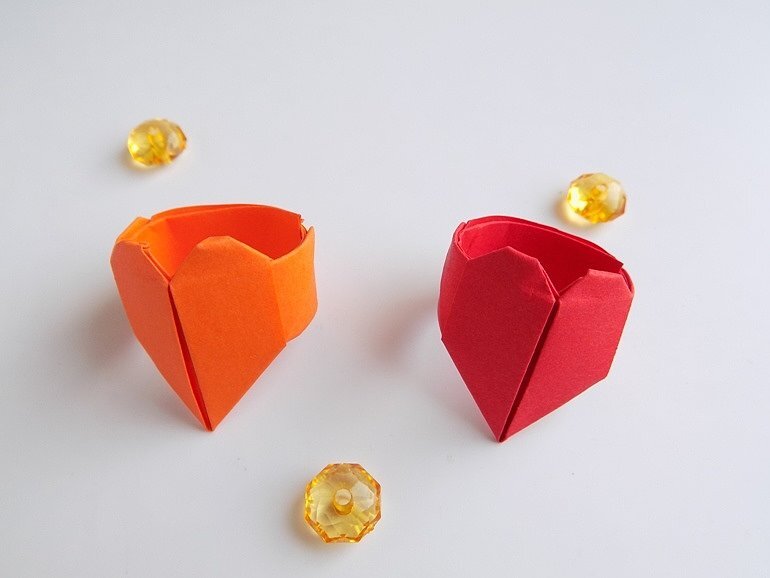 Украшения для маленькой девочки совсем не обязательно должны быть настоящими. Иногда гораздо интереснее их сделать самим. Например, по предложенному нами мастер-классу из бумаги вы можете изготовить колечко с сердечком. Для изготовления такого колечка нам хватит квадратного листа со стороной 10 см. Сначала выполняем на квадрате поперечные сгибы, складывая его пополам. Затем верхнюю и нижнюю сторону загибаем к середине. Отогнем эти сгибы, после чего края загнем к ближайшей линии сгиба. Снова полностью развернем квадрат. Берем нижний его край и подгибаем ко второй линии, расположенной сверху. Аналогично поступаем с верхним краем, который загибаем ко второй линии, расположенной снизу. Такие сгибы получаются на нашем квадрате. Теперь выполним сверху сгиб назад на ширину одной полоски. Перевернем лист, после чего загнем боковые уголки к середине. Так мы начинаем формировать сердечко. Снова перевернем заготовку. Верхний уголок загнем на ширину двух полосок. Развернем заготовку колечка обратн