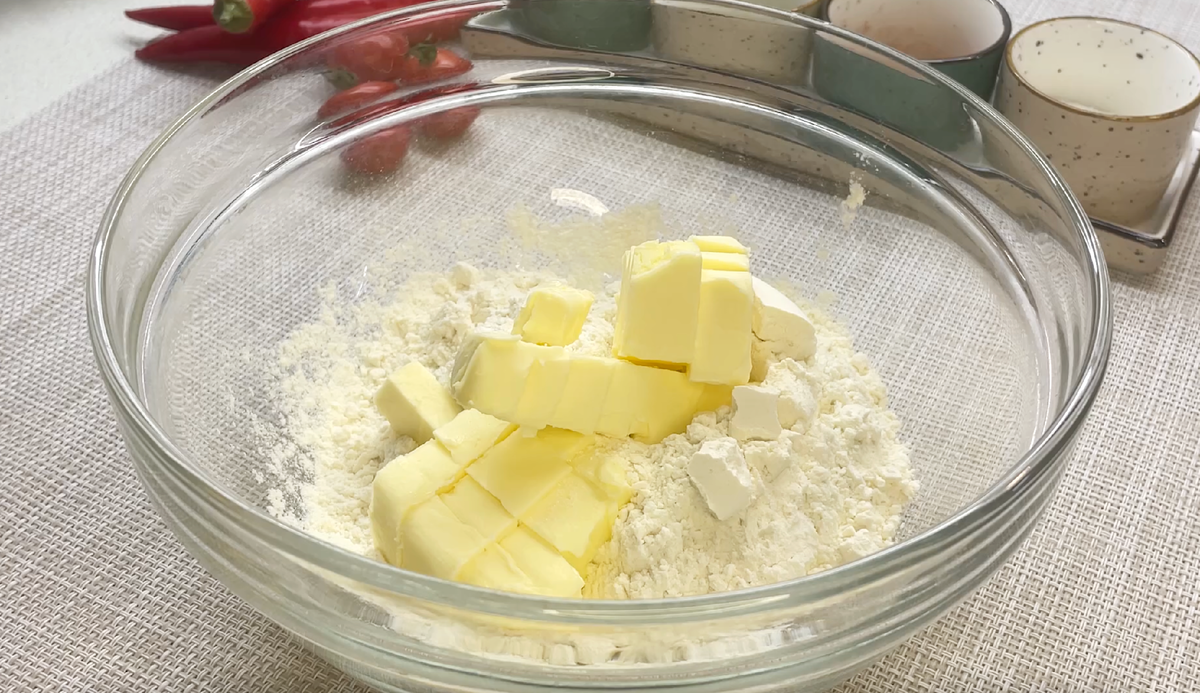 Сначала замесим тесто: смешаем муку, сливочное масло и перетрем в крошку.