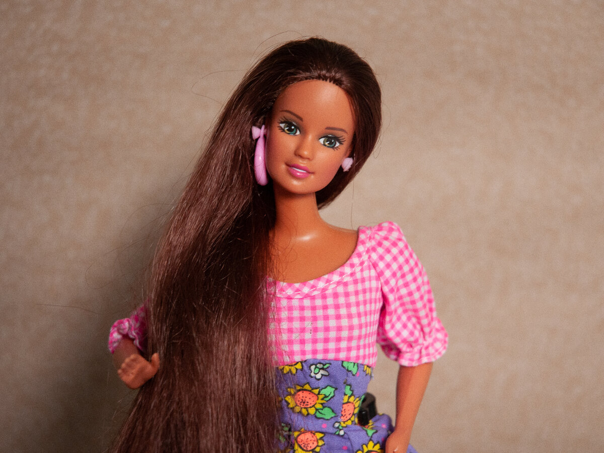 Три года назад в марте я купила двух своих первых винтажных кукол - Терезу Blossom Beauty 1996 года выпуска и Терезу Sun Flower 1994 года выпуска. Это целиком их заслуга, что я в итоге подсела и на Барби, и на винтажных кукол в частности 😁 Blossom Beauty я потом продала во время одной из чисток, а Sun Flower оставила. Её нельзя назвать популярной у коллекционеров. Честно говоря, я вообще не припомню, чтобы видела её у кого-то, кроме меня, но почему-то именно эта Тереза у меня самая любимая. В марте 2020-го она приехала ко мне в таком вот виде. Сейчас мне больно смотреть на этот шухер на голове Терезы, платье с дыркой и одинокую серьгу, но из песни слова не выкинешь)) Платье родное и довольно милое, до сих пор его храню. Рано или поздно, но мне надоедает один и тот же образ у куклы, даже если считаю его удачным. С Терезой тоже вскоре после приезда начались эксперименты. После родного платья некоторое время Sun Flower стояла в платье от Авроры из ФиксПрайса. Но оно надоело мне доволь
