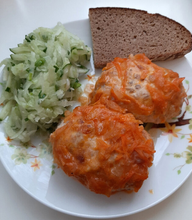 ✓ Соль, перец - по вкусу. В куриный фарш добавить яйца, соль, перец, измельчённый лук (1 шт.), тщательно перемешать. Соединить фарш с гречкой, снова хорошо перемешать. Из полученного фарша сформировать котлеты, выложить в форму для запекания. Вторую луковицу и морковь обжарить на сковороде на оливковом масле, добавить томатный соус и сметану, хорошенько перемешать, залить водой (400-500 мл). Дать покипеть 5 минут, и этой заливкой залить котлеты. Тушить в духовке при температуре 200 градусов до готовности, примерно 25-30 мин с момента закипания. Салат: редьку (маргеланская) очистить и натереть на крупной терке, огурец нарезать тонкой соломкой, зелёный лук мелко покрошить, посолить и заправить оливковым маслом. Готово! Салат не рекомендуется, если есть проблемы с ЖКТ. Хлеб ржаной бездрожжевой, без сахара. Больше
