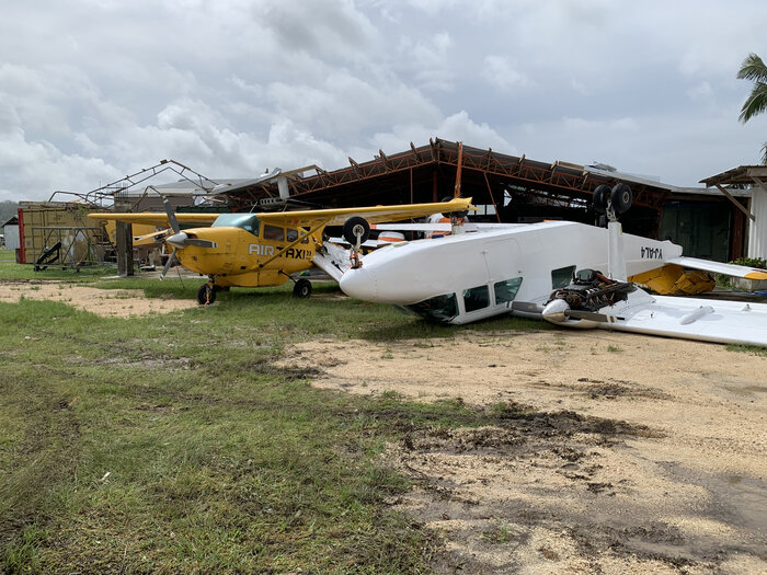 Пострадали самолеты соседних компаний, несколько швартовок не выдержало и самолеты опрокинуло. Как минимум 4 самолета полностью под списание, наши борты в порядке, Пайпер получил удар по килю, под замену элеватор, но остальные вроде ок. Здание аэропорта тоже пострадало.