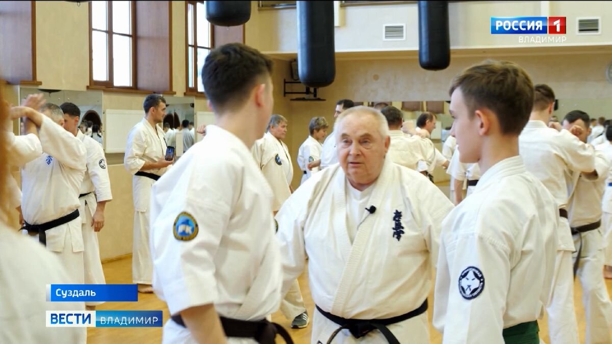 Легенда карате - в Суздале. В туристическом комплексе Арт-отеле "Николаевский посад" мастер-класс провел основатель Федерации кёкусинкай России Александр Танюшкин. В зале сто сорок спортсменов — именитые каратисты, заслуженные мастера, чемпионы мира, шиханы и сенсеи. И все они приехали в Суздаль в туристический комплекс Арт-отель «Николаевский Посад» ради встречи с одним человеком. Основателем Федерации кёкусинкай России, обладателем 8-го дана, легендой отечественного карате — Александром Ивановичем Танюшкиным. - Я ставлю руки, видите? И я на животе его поворачиваю. Видите? Руки, живот - сила. Сергей Чубаров, председатель Владимирской областной общественной организации «Федерация кёкусинкай»: - Спорт, который мы видим на татами, он раскрывает только часть именно спортивной составляющей нашего стиля. А методика, которую преподает Александр Иванович Танюшкин, именно раскрывает всю сущность применения базовой техники: блоков, стоек. Методика действительно уникальна. Александр Иванович объ