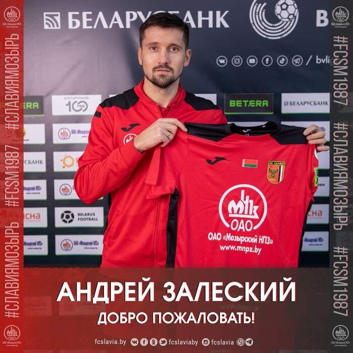 Защитник Андрей Залеский стал игроком мозырской "Славии". "Родился 20 января 1991 года в Новогрудке. Начал заниматься футболом в ДЮСШ города Лиды. Первый тренер Витаутас Юозович Янчаускас. Профессиональную карьеру начал в минском "Динамо" в 2008 году, выступал за дубль. В сезоне 2009 года дебютировал в чемпионате Беларуси. Два года провел в аренде в фарм-клубе "Береза"-2010. В 2014 году вернулся в "Динамо", играл в основном составе команды. В конце 2014-го покинул "Динамо" по окончании срока действия контракта. В феврале 2015-го подписал контракт со "Слуцком". Закрепился в основном составе, играл на позиции левого защитника или опорного полузащитника. В декабре продлил контракт с клубом. В сезоне-2016 являлся игроком основного состава, выступал на разных позициях в обороне. В сезоне-2017 был задействован в качестве правого защитника. 2 февраля 2018 года на правах свободного агента подписал контракт с "Динамо-Брест" на один год с возможностью продления еще на один. В январе 2019 года по