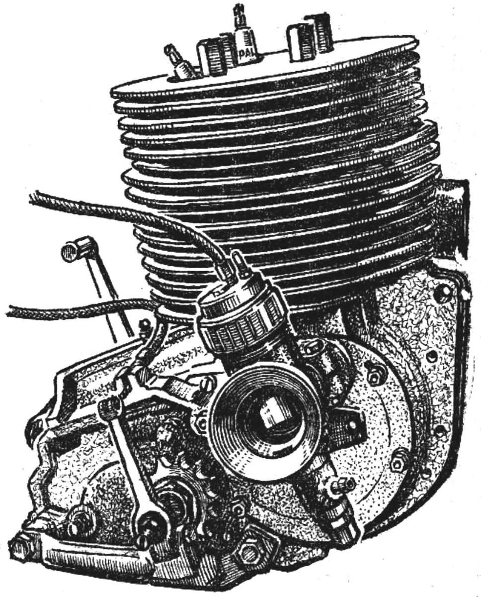 В двигателе использованы без переделок почти все детали коробки передач, пусковой механизм и левая крышка картера. Для увеличения надежности узла передачи использована двухрядная цепь, моторная звездочка, барабан сцепления и первичный вал от спортивного двигателя К-175 СК с передаточным отношением 1: 2,75. Устройство и расположение основных элементов двигателя показаны на рисунке 1.